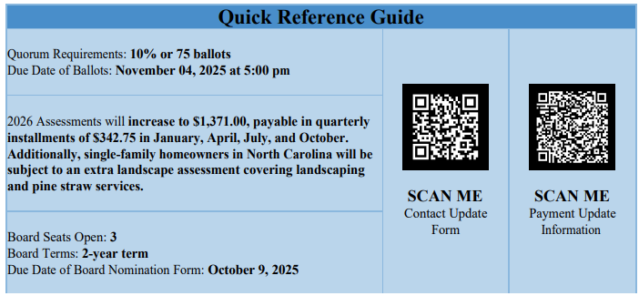 Thursday, October 9th at 6pm: Annual Membership & Budget Ratification Meeting This meeting will be held virtually on the Zoom platform. Details will be provided as the date approaches. The purpose of the meeting is to provide community updates, elect members to the Board of Directors, review the 2025 financial position, and ratify the 2026 budget. Because owners can nominate from the floor during the meeting, the ballot will be sent electronically after an opportunity for meeting the candidates.