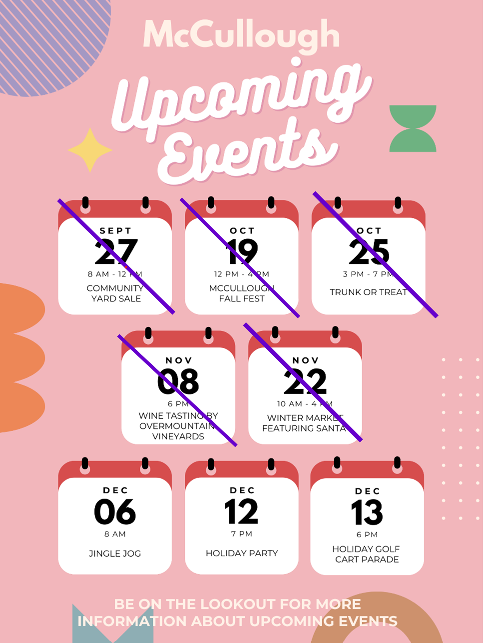 Communications To help reduce the number of emails you receive from the Association, the Board will now (try to limit) communication to one weekly neighborhood email with important announcements, upcoming events, things to know, etc. The weekly email will be called McCullough Minute and will be sent on Wednesdays. Other emails may be sent separately as necessary, but we will do our best to stick to the weekly email. | EBlasts & Updates The Board has received several inquiries regarding the display of political signs and flags within our neighborhood. This is a reminder that the McCullough Covenants specifically address this matter in Article VI: Use Restrictions and Rules, Section 3: Signs. Political signs are those advocating for voters to elect a certain candidate for public office or to vote one way or another on a certain issue. A political sign may only be displayed on McCullough properties if it is no larger than four (4) square feet, is displayed no sooner than forty-five (45) days prior to the election, and is removed within seven (7) days after the election. Flags advocating for the election of one candidate/issue or another fall under this "sign" definition and must me the same restrictions. Please note that the board has the authority to impose a fine of up to One Hundred Dollars ($100) per day for violations of this Section. Thank you for your cooperation and understanding.
